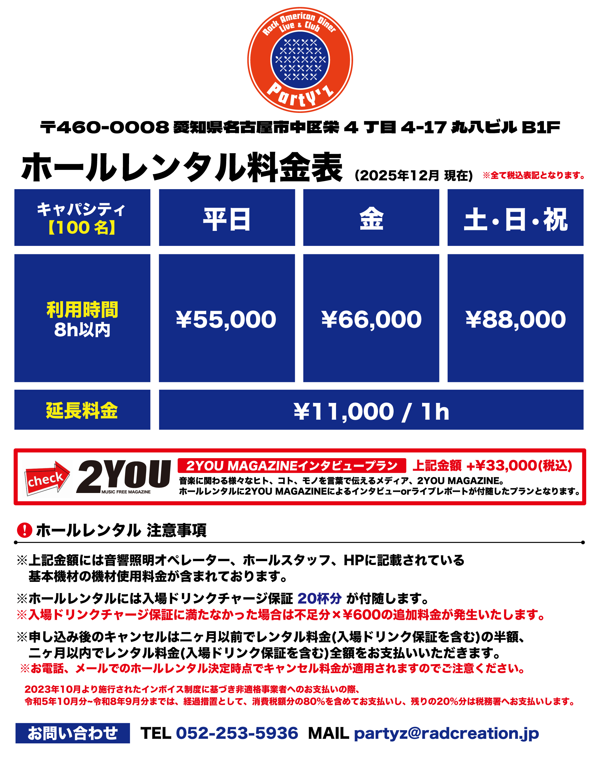 R.A.Dの前の通り沿いにあります。 栄駅13番出口を直進。 はじめの曲がり角を中日ビル沿いに左折し、直進。 R.A.Dを通り過ぎて、すぐ左手にあります!